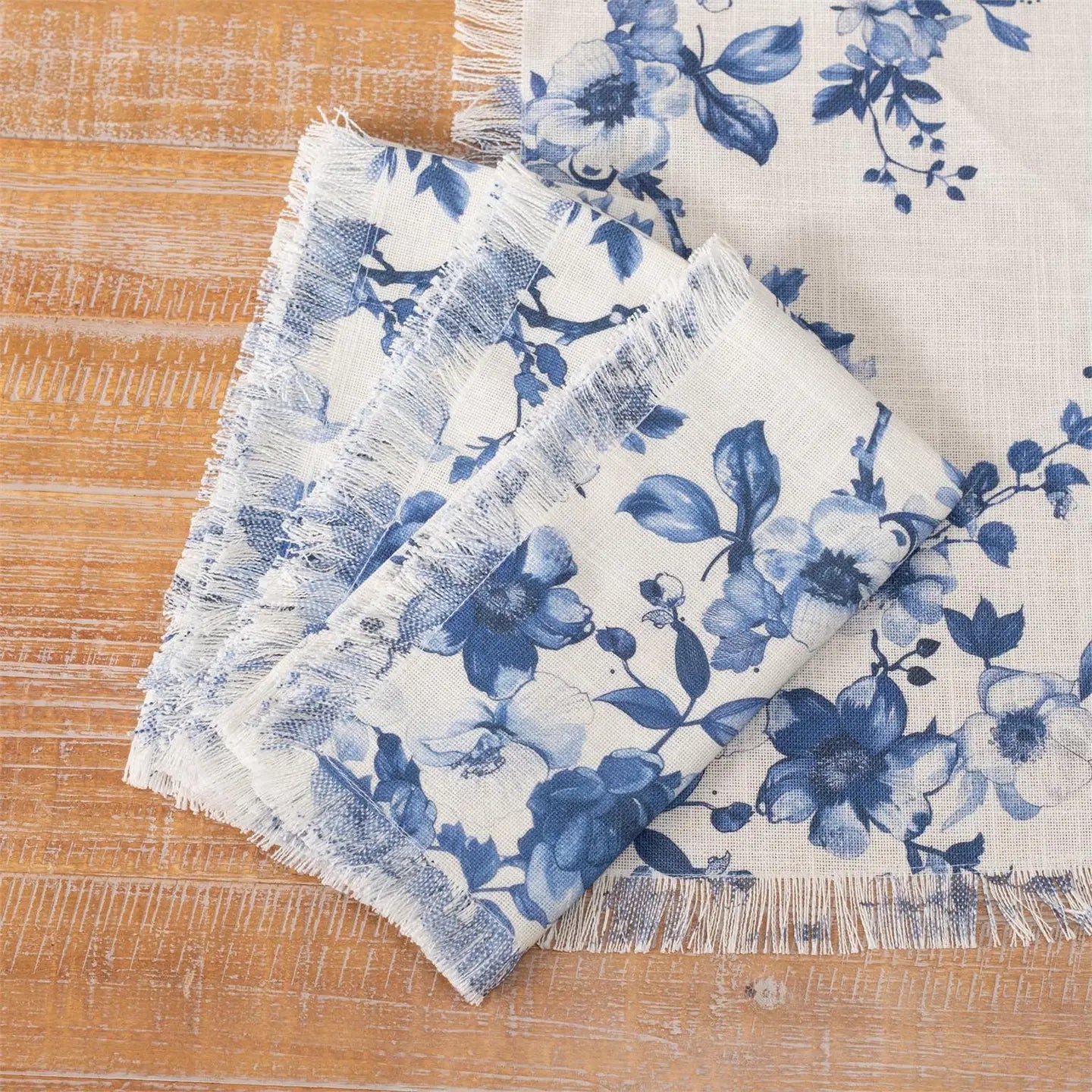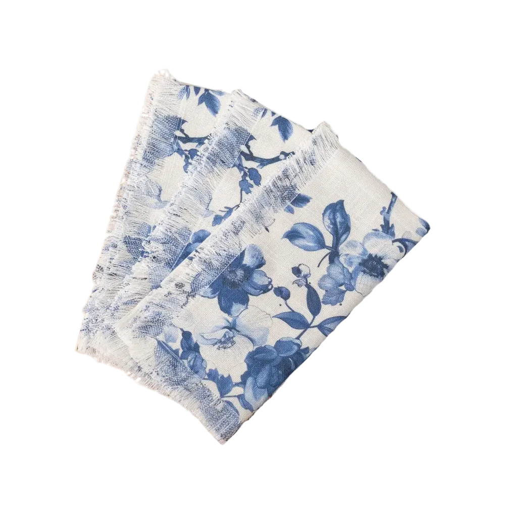 Elevate your table setting with these charming blue floral fringe napkins. This set of four features delicate floral patterns in soothing blue tones, accented with decorative fringe edges that add a touch of elegance to any meal. Perfect for everyday dining or special occasions, these napkins bring a fresh, botanical aesthetic to your tablescape. Ideal for adding visual interest while protecting your table and guests' clothing.