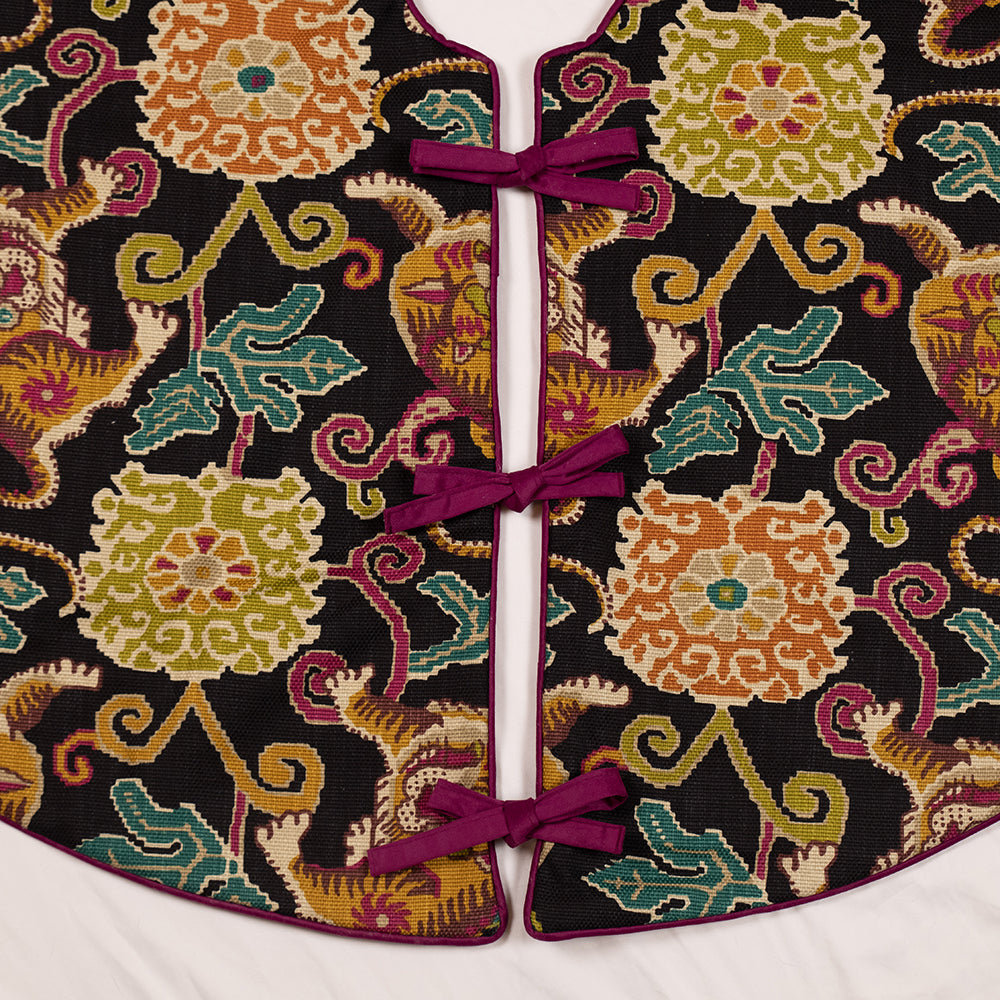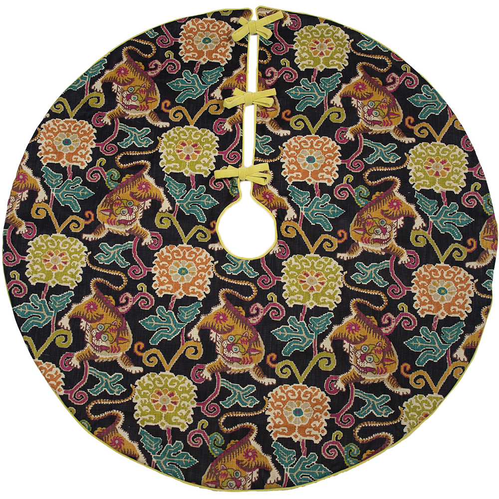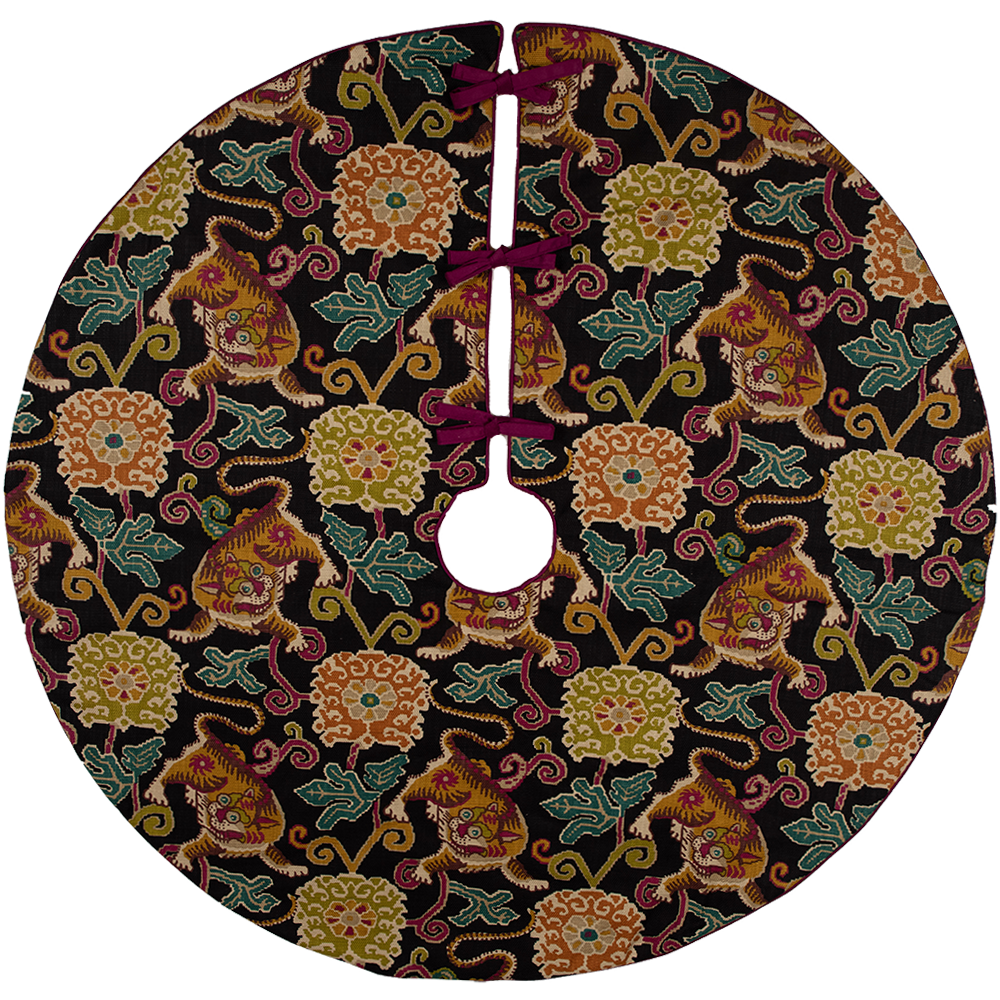 This tree skirt combines a fun, brightly patterned front side with a beautiful velvet solid colored backing. Reversible, with a flip of the tree skirt you have an instant new look for your Christmas tree! The rich Jewel Tones make these tigers the perfect holiday accent