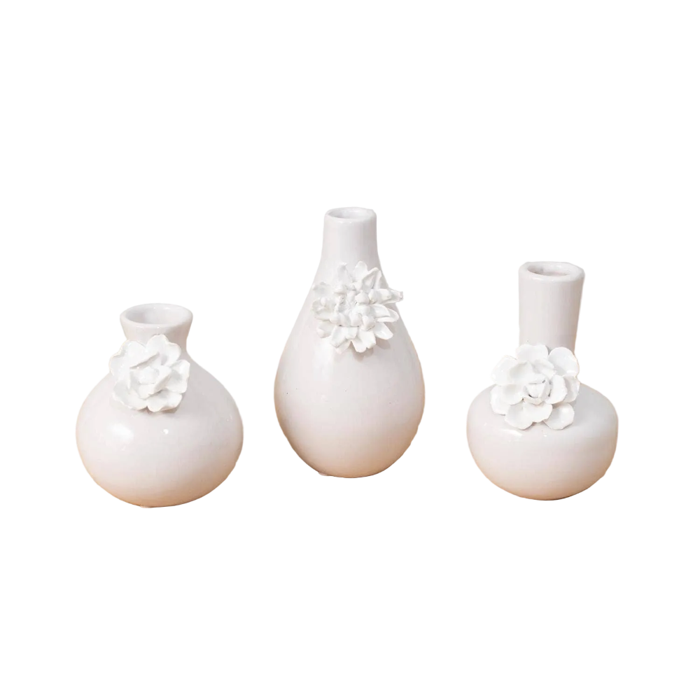 Elevate your décor with this charming set of three bud vases, each featuring intricate 3D floral detailing that brings botanical artistry to any space. Perfect for displaying fresh flowers, dried botanicals, or standing alone as sculptural accents, these versatile vases work beautifully on shelves, nightstands, or windowsills. The dimensional floral designs add texture and visual interest while their compact size makes them ideal for small arrangements or single stems. A thoughtful gift for plant lovers and design enthusiasts alike.