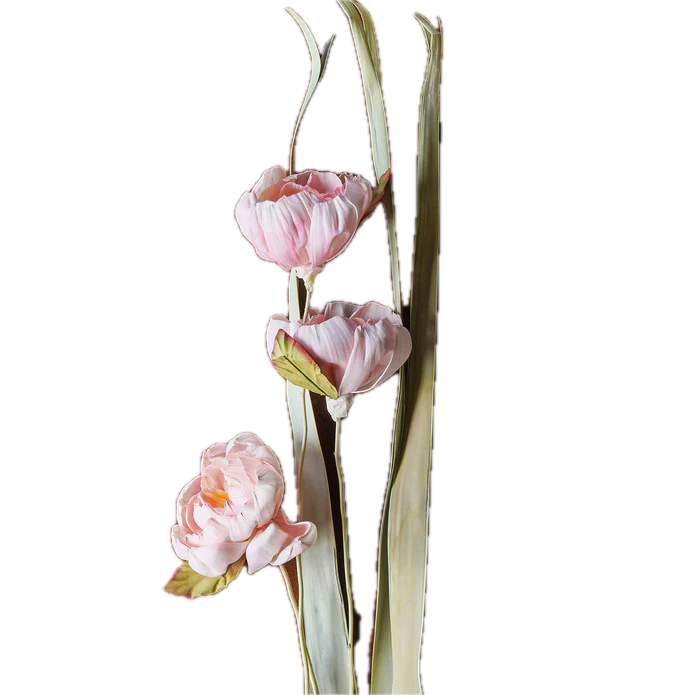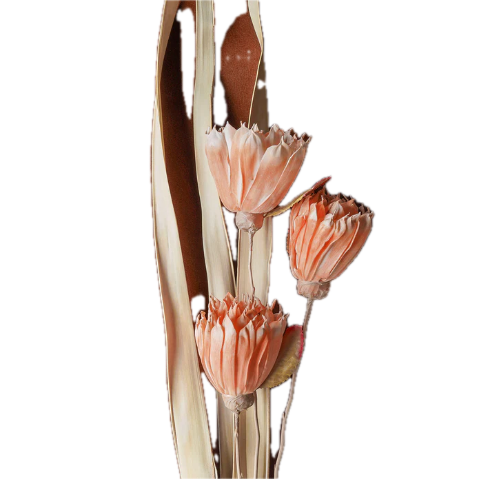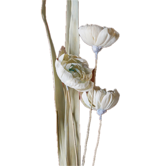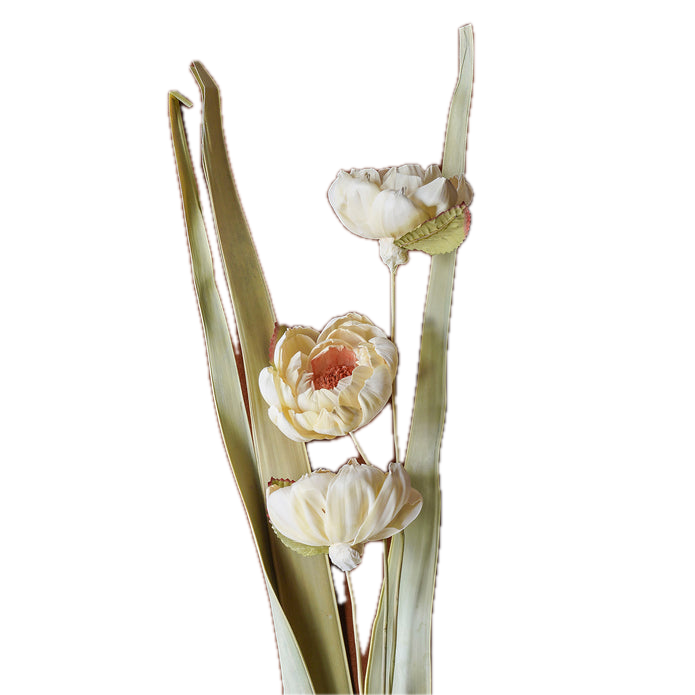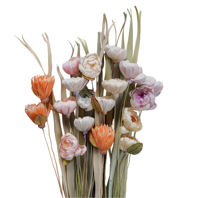 The Sola Rose Stem Mixed Color, 40", is an assortment of hand-crafted Sora florals combined with dried long leaves. Each bundle is paper-wrapped. The Sora floral is hand-dyed and crafted, so there are slight variations in color and size.